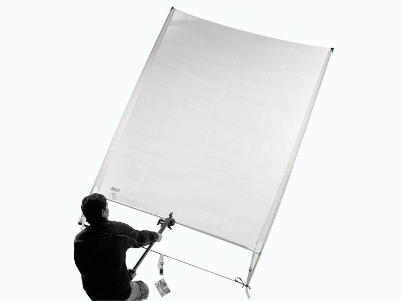 Sunswatter es un ‘butterfly’ de 180x240cm que se puede manejar de mano (sin trípode). Elimína sombras fuertes cubriendo hasta 5 personas y con la posibilidad de caminar con los modelos. 1/3screen – deja un highlight, 2/3 screen – borra el highlight, 3/3 screen – crea sombra.